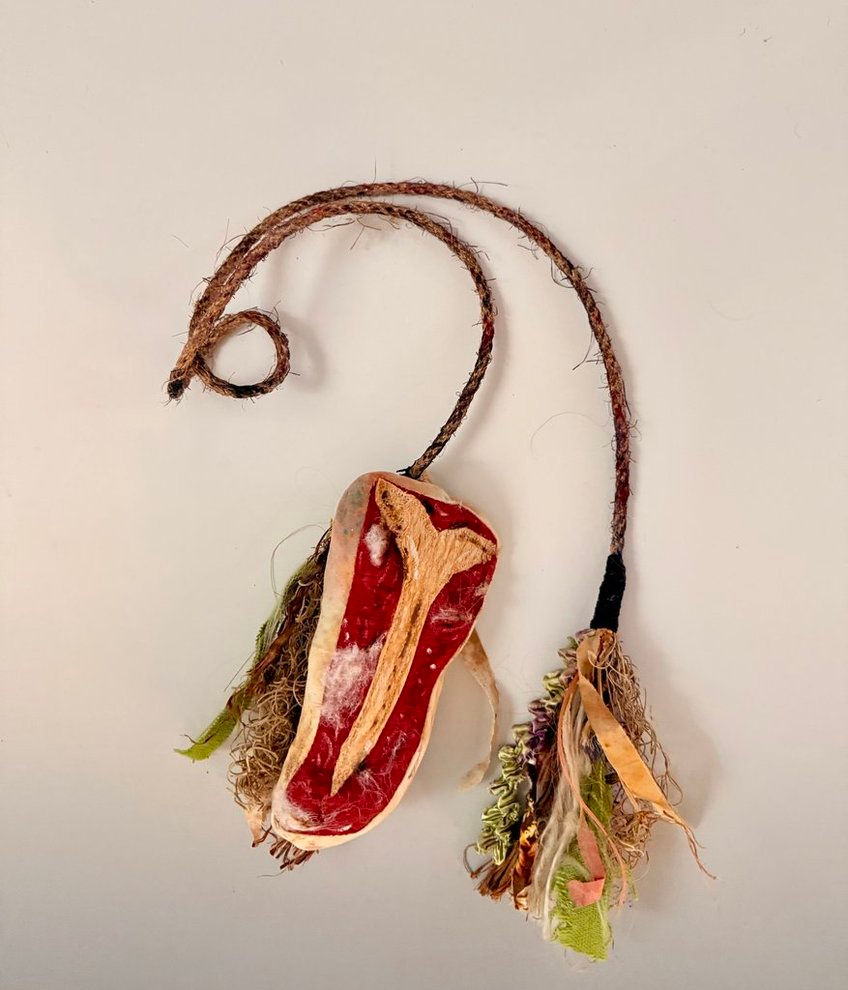 (hanging assemblage) Media: Found objects (pumpkin, wood, cheesecloth, soggy trampled cardboard outside of the ceramics' studio, papaya tree trunk that died from a cold freeze, coral my sister found at Key West beach, plastic man, glass beads, my hair, dryer lint, natural dyes and pigments, Elmer's glue Dimensions: 14” W, 15” H, 3” D Completed: 2023 Contact me for purchase