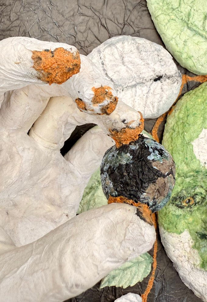 Media: metal, natural pigments, paper pulp from recycled paper, Elmer's school glue Dimensions: 14” W, 9” H, 11" D Completed: 2025