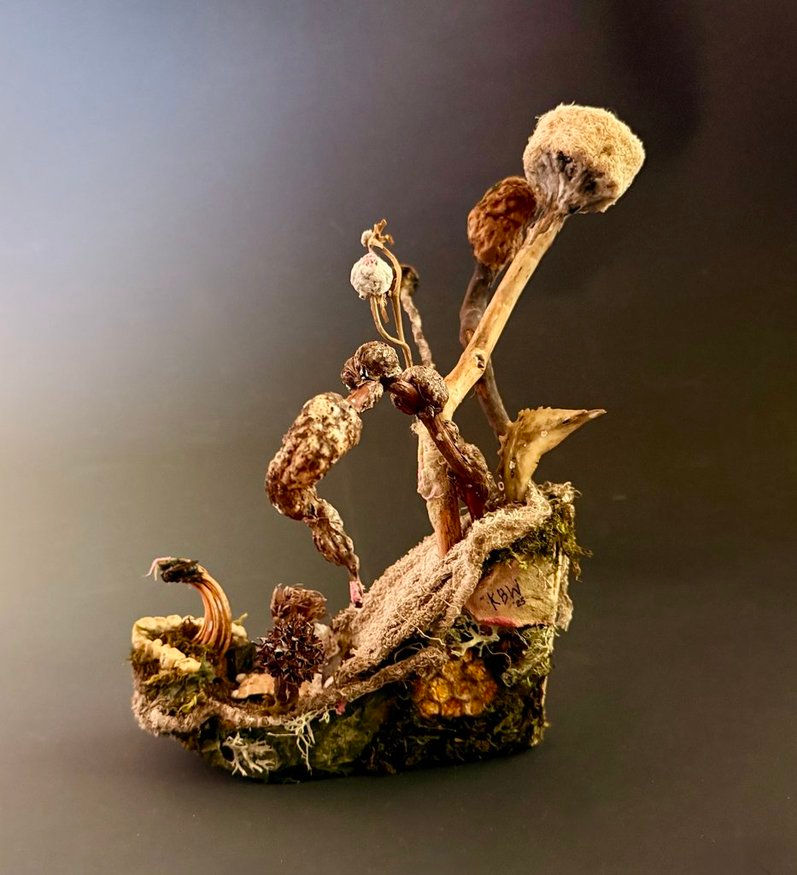 Pedestal sculpture - assemblage Media: Found objects, natural pigments, paper pulp Dimensions: 8.5” W, 11” D, 10.5" H, Completed: 2025 Contact me for purchase